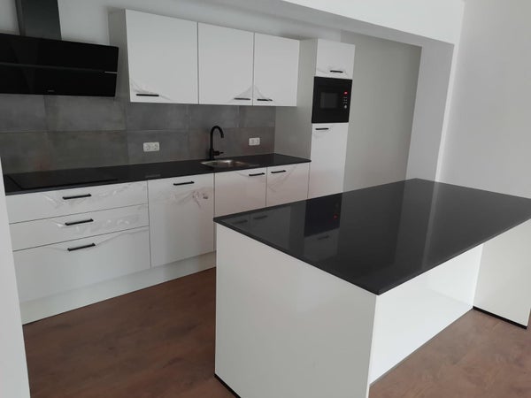 El apartamento cuenta con una amplia sala de estar con cocina abierta. La sala de estar tiene mucha luz natural y ofrece acceso al balcón. La cocina de lujo está equipada con electrodomésticos modernos incorporados, que incluyen una placa de inducción eléctrica, campana extractora, lavavajillas y una combinación de frigorífico y congelador.