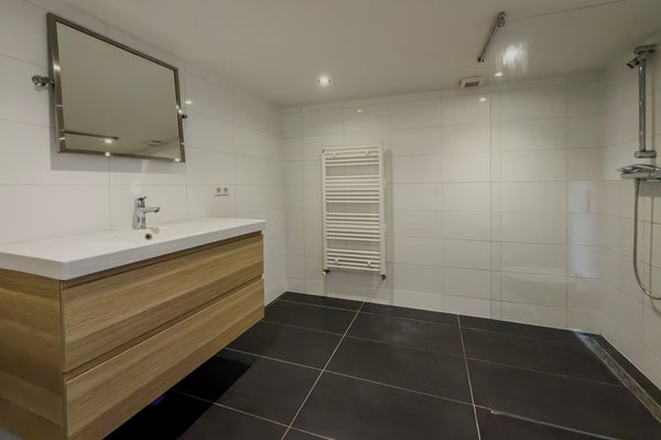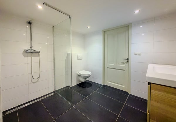 El segundo piso tiene dos habitaciones espaciosas, que son idénticas en tamaño. El baño es moderno y cuenta con una ducha a ras de suelo, un mueble de lavabo y un inodoro. También hay un cuarto técnico con conexiones para una lavadora y un lugar para la instalación de calefacción central. No se proporciona lavadora.