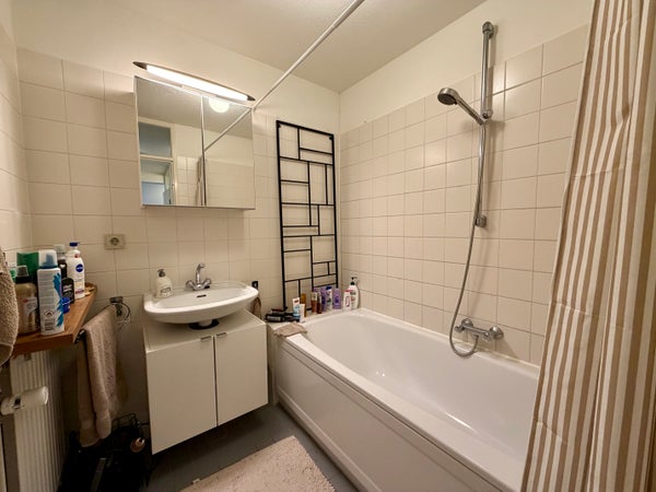 Primer piso: Fuera del apartamento se encuentra el cuadro eléctrico. Acceso al apartamento a través de un amplio pasillo. Entrada con acceso a todas las habitaciones. Amplio salón con mucha luz natural gracias a las grandes ventanas. Cocina abierta limpia, en una disposición en esquina. La cocina está equipada con nevera, placa de cocina, campana extractora, horno, lavavajillas y fregadero. Junto a la cocina hay un espacio de almacenamiento con conexión para lavadora. Desde el salón se accede al amplio balcón. El balcón se encuentra en el noreste. El pasillo da acceso a dos amplias habitaciones, un aseo separado y un baño. El baño está equipado con lavabo y bañera.