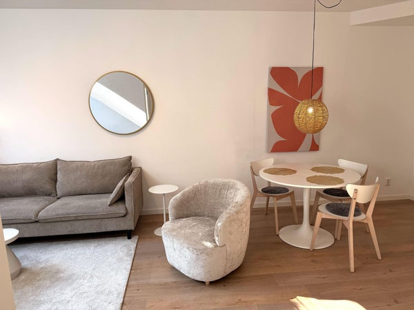 La entrada está en la planta baja, donde entras directamente a la sala de estar. La propiedad ha sido recientemente renovada y se ve excelente. Hay un área de estar con un sofá, una mesa de café, un mueble para el televisor, etc., y un área de comedor con una mesa de comedor.