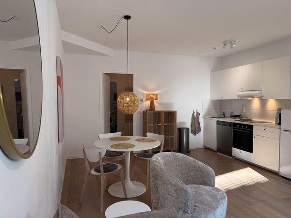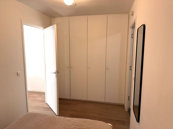 A través del dormitorio, accedes al baño con un mueble de lavabo, un inodoro suspendido y una ducha a ras de suelo.
