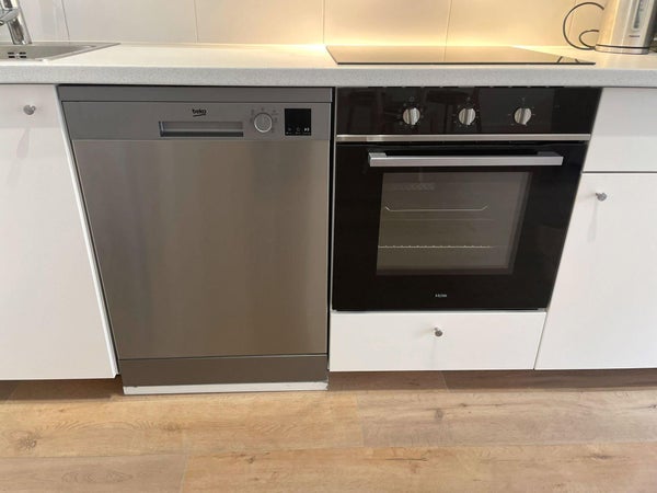 Hay una cocina abierta equipada con placa de cocina, horno, lavavajillas y combinación de nevera y congelador.