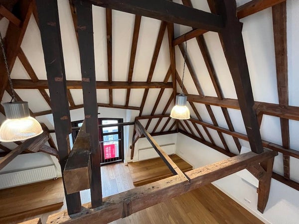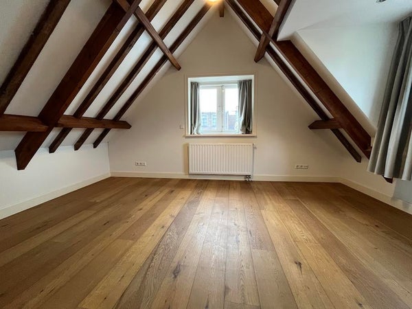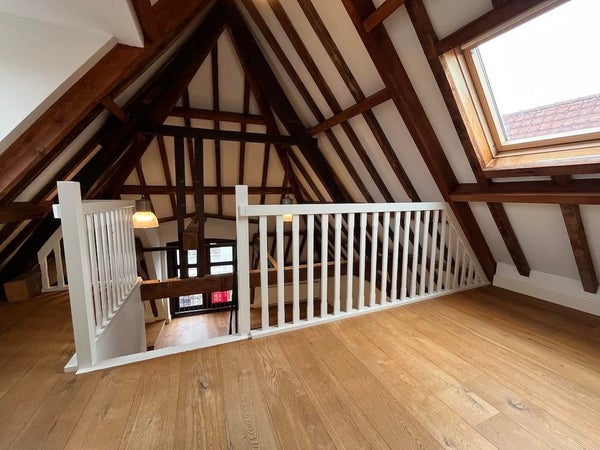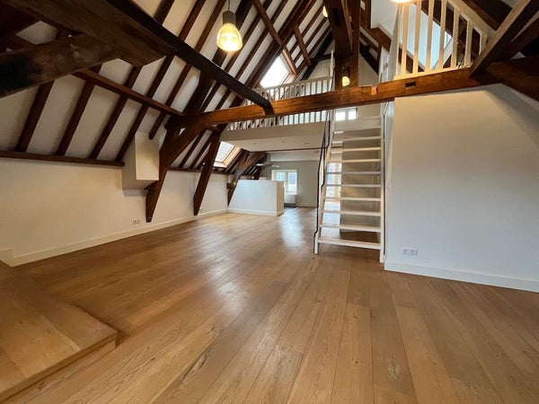 Distribución: Entrada compartida. Sala de estar muy espaciosa de aproximadamente 80m2 con un hermoso suelo de madera y vigas de madera auténticas. Cocina abierta con electrodomésticos integrados. También en este piso se encuentra el baño con ducha, lavabo y un aseo separado. Escaleras al ático con una amplia habitación en la parte trasera (aprox. 14m2). Lavadero separado (conexión para secadora y lavadora).