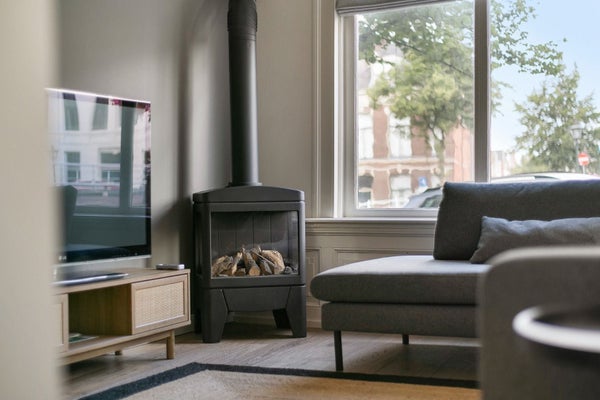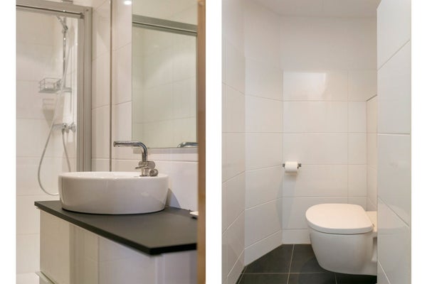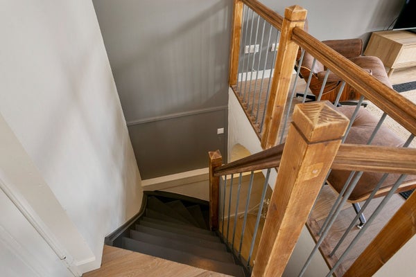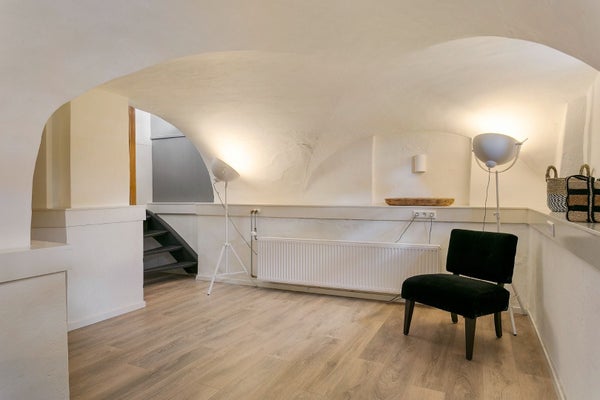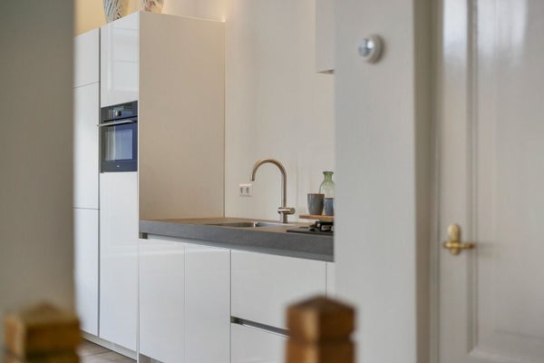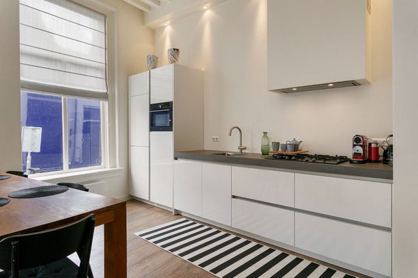 Distribución: Planta baja: En la esquina de Oude Vest con Lange Mare está la entrada del apartamento. La sala de estar tiene un carácter abierto con techos altos y las ventanas correderas originales que permiten mucha luz. La cocina moderna en disposición lineal cuenta con todos los electrodomésticos integrados habituales, como un refrigerador y congelador de gran tamaño, lavavajillas, cocina de gas de 5 fuegos y un horno combinado. Desde la sala de estar, hay un acceso al baño con ducha y un mueble lavabo. También hay un aseo separado con inodoro suspendido y lavabo.