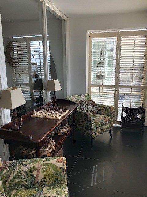 Al final del vestíbulo, entras en la sala de estar. Esta es muy luminosa y se siente espaciosa gracias a las grandes ventanas. La sala de estar está equipada con un gran sofá, un mueble para TV, una silla de lectura y una mesa de comedor para seis personas.