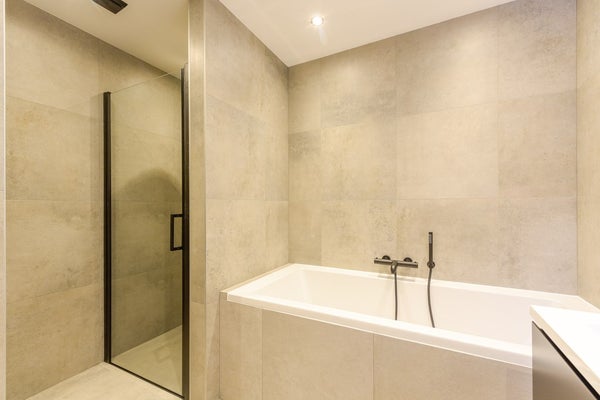 • Baño renovado muy lujoso con ducha efecto lluvia, radiador de diseño, lavabo con armario, espejo con iluminación integrada y bañera;