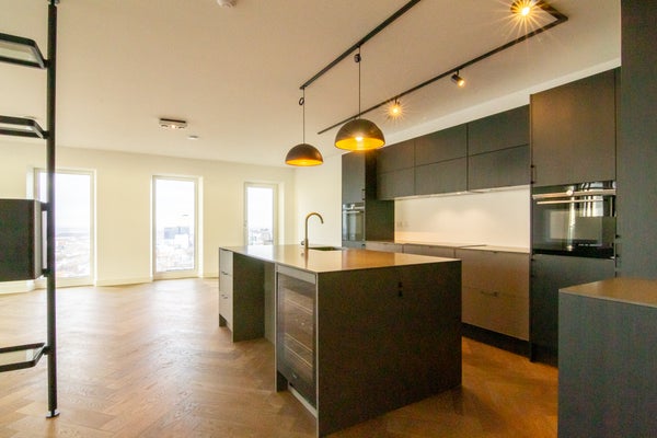 The living area, the living room with an open kitchen, is very spacious, has a practical layout, and has maximum light. The luxury kitchen is equipped with an induction hob, extractor hood, fridge, freezer, oven, microwave, wine cooler,