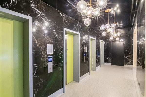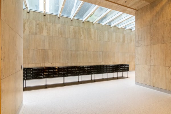 closed central entrance with doorbells, intercom, mailboxes, and access to the elevators.