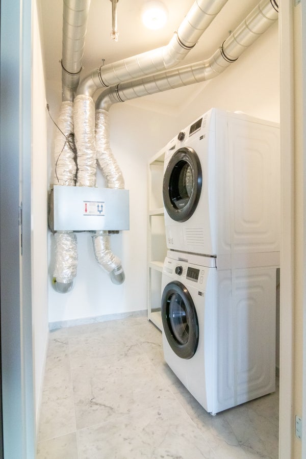 The property also has a storage room where the washing machine and dryer are located.