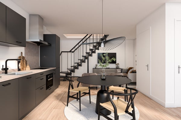 En el lado izquierdo se encuentra la cocina abierta, que está en conexión directa con la sala de estar. Esto crea un espacio de vida abierto y social. La escalera hacia el piso superior está inteligentemente ubicada en la sala de estar y ocupa poco espacio. Además, hay un armario empotrado, ideal para almacenamiento adicional.