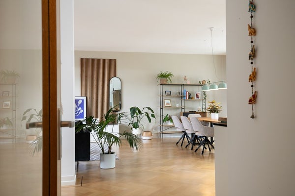 Entrada al apartamento en el 2º piso en el pasillo con acceso a todas las habitaciones. La luminosa sala de estar está ubicada al frente con vistas a la Rochussenstraat. Hay una encantadora zona de estar creada con un sofá en esquina, alfombra, mesas de café y un mueble de televisión con una televisión moderna. La encantadora mesa de comedor ofrece espacio para 8+ personas, ¡ideal para organizar una cena con amigos! Desde la sala de estar se puede acceder al balcón situado en la parte trasera. Un lugar encantador para disfrutar de los meses de verano más cálidos y para disfrutar de bebidas por la noche o un café por la mañana. Aquí encontrarás un moderno conjunto de lounge con mesa de café y una caja de almacenamiento para los cojines.