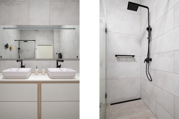 El moderno inodoro también es accesible desde el pasillo y el almacenamiento interno proporciona espacio de almacenamiento adicional y ofrece acceso a la lavadora-secadora combinada.