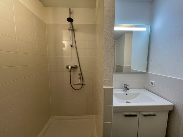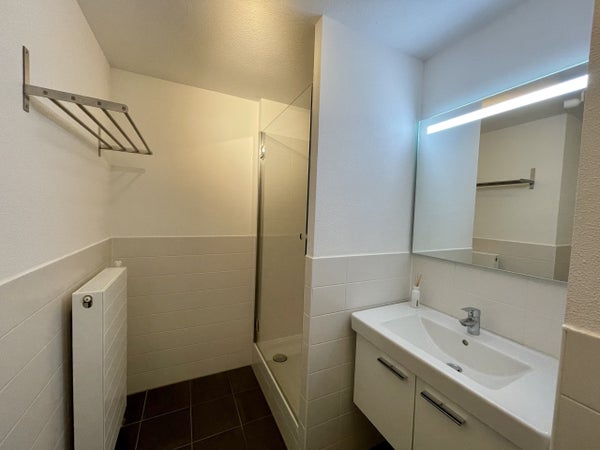 Entrada compartida con intercomunicador, buzones y ascensor. Entrada al apartamento en el noveno piso. A través del pasillo se accede a la luminosa sala de estar con grandes ventanales y acceso al balcón en la parte trasera. La cocina abierta está decorada en una paleta de colores claros y equipada con un frigorífico/congelador, placa de inducción, extractor y fregadero. El baño, también en colores claros, cuenta con una amplia ducha, lavabo con espejo, radiador de diseño y WC. El dormitorio está situado en la parte delantera de la vivienda. En el pasillo hay un armario con conexión para la lavadora.