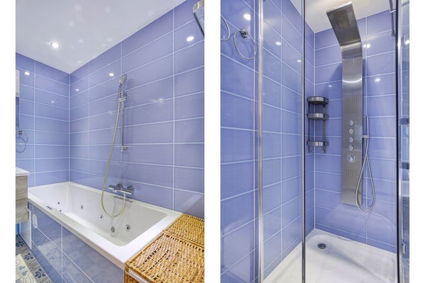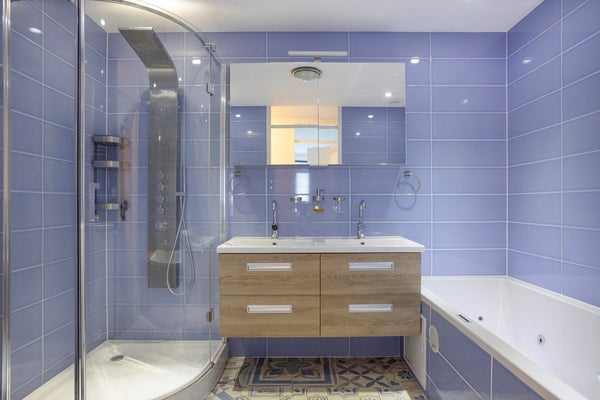 El baño está decorado de manera cómoda, con una amplia ducha a ras de suelo, un lavabo ancho con gran espejo y una cómoda bañera con función de hidromasaje.