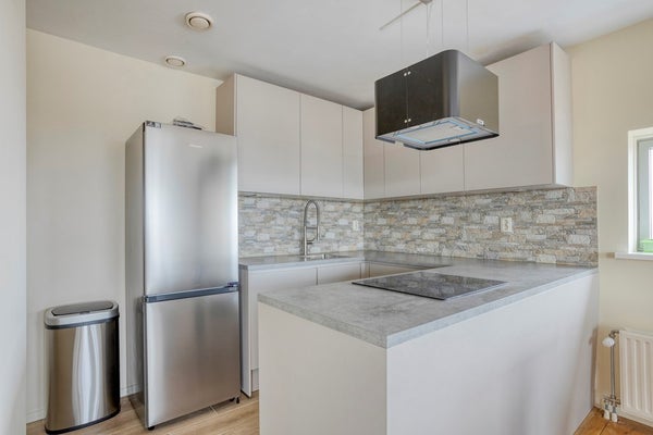 La cocina está junto a la sala de estar y está completamente equipada con electrodomésticos modernos, incluyendo una placa de inducción, campana extractora, lavavajillas, frigorífico y un horno combinado. Gracias a la distribución práctica, tienes suficiente espacio de trabajo y almacenamiento.