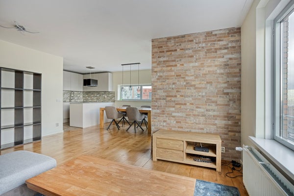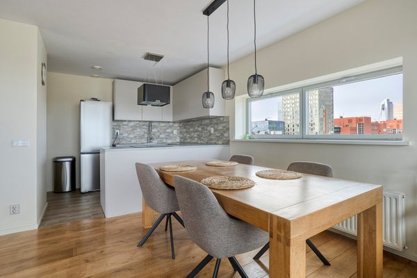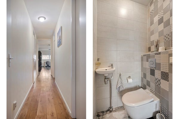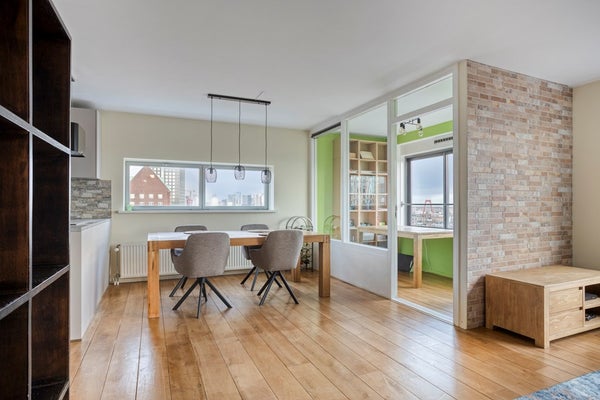 Al final del pasillo se encuentra la sala de estar. A la derecha, hay una zona de estar con un sofá en esquina y una vista abierta sobre Rotterdam. Esta sala de estar ofrece todo lo que estás buscando. En la mesa del comedor, que está conectada a la sala de estar, hay espacio para seis personas.