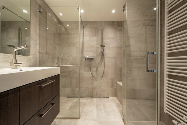 El baño es generosamente espacioso y acabado modernamente. Equipado con un lavabo extra ancho con un gran espejo, grifos dobles y una amplia ducha a ras de suelo.