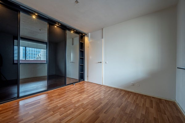 La habitación principal cuenta con un hermoso armario empotrado que se extiende del suelo al techo. Hay más que suficiente espacio para una cama grande, mesas de noche e incluso un escritorio. Es una habitación tranquila, luminosa y bien diseñada.
