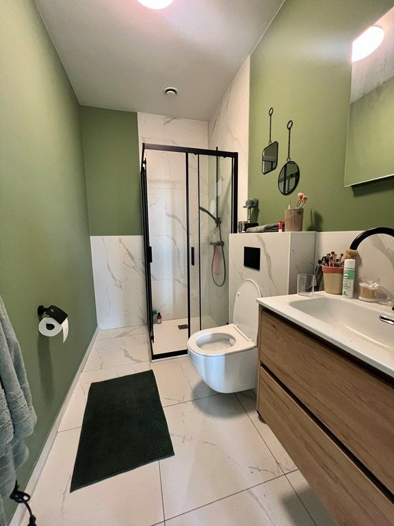 El baño está equipado con ducha, mueble lavabo con espejo y un inodoro.