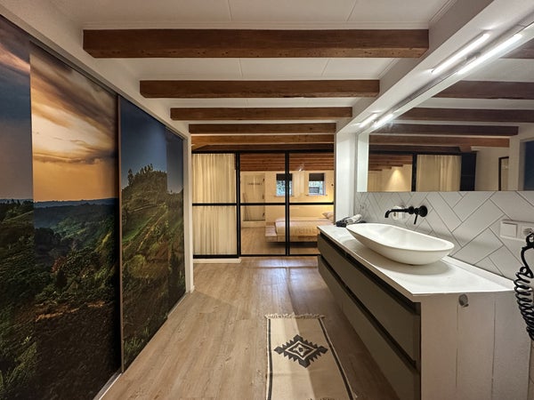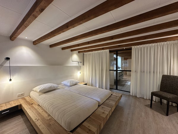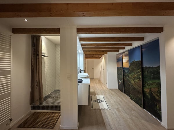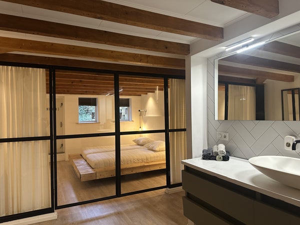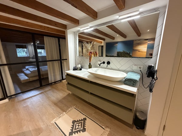 Por una escalera hacia abajo, llegas al sótano, donde se encuentran los dormitorios y el baño. En la parte delantera está el dormitorio más pequeño, ideal como habitación infantil o estudio. En el medio se encuentra el baño abierto con lavabo, mueble y espejo, así como una amplia ducha a ras de suelo.