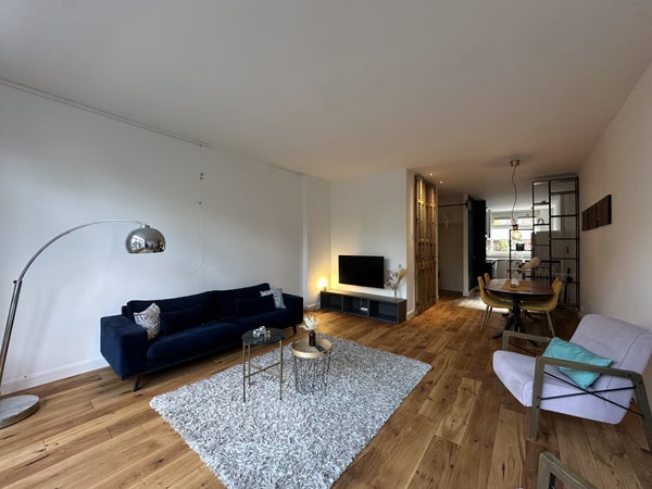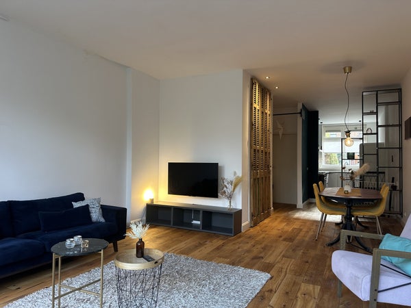 equipada con un suelo de madera y amueblada con un sofá azul oscuro, dos sillones, una alfombra, una mesa de café y un mueble para la televisión. A través de dos puertas de cristal tienes acceso al balcón y al jardín, por lo que el interior y el exterior se combinan a la perfección. Además, la sala de estar y la cocina están separadas por la mesa del comedor con sillas y un práctico armario abierto.