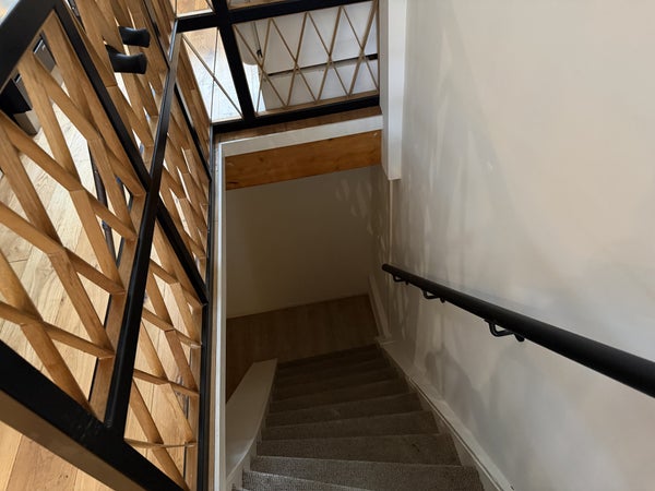 La propiedad se distribuye en dos niveles y combina acabados modernos con elementos característicos, como un cálido suelo de madera y vigas visibles en el sótano.