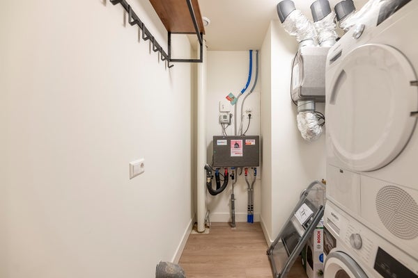 El baño es moderno y espacioso, equipado con una ducha de lluvia a ras de suelo, bañera, lavabo con espejo y toallero. El inodoro es independiente e incluye un pequeño lavabo. Un trastero privado con combinación de lavadora/secadora es accesible desde el vestíbulo.