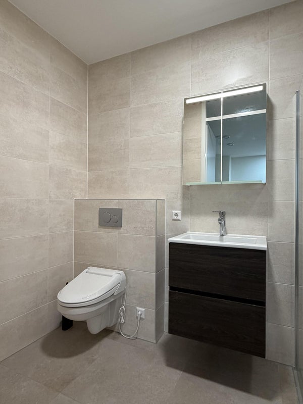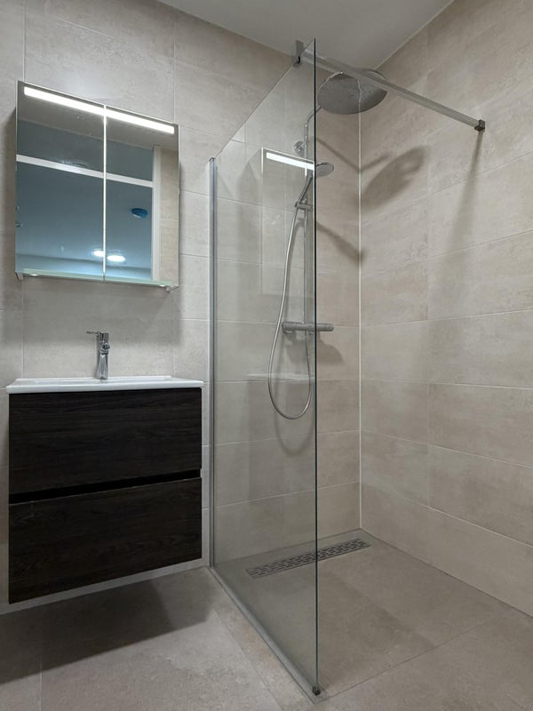 - Baño con inodoro, bidet, ducha a ras de suelo y lavabo con espejo;