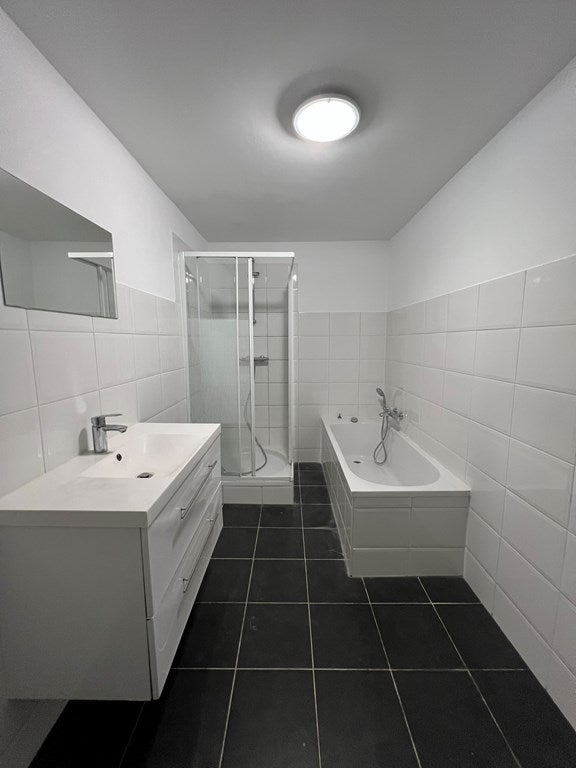 El baño está equipado con bañera, ducha, radiador toallero, lavabo y espejo.