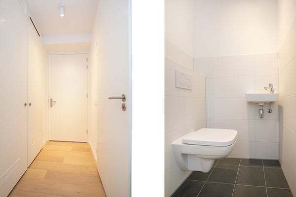 La habitación principal ofrece suficiente espacio para una cama doble y un armario y también proporciona la misma increíble vista. ¡Desde aquí puedes acceder a la segunda terraza! La segunda habitación también es de buen tamaño y es muy adecuada como oficina en casa o dormitorio de invitados. Desde el pasillo puedes acceder al baño, que tiene una gran ducha a ras de suelo y un lavabo con espejo. Se instalará una pared de vidrio lo antes posible en este baño. Desde el vestíbulo puedes acceder al aseo separado y al espacio de almacenamiento interior con conexión para la lavadora.