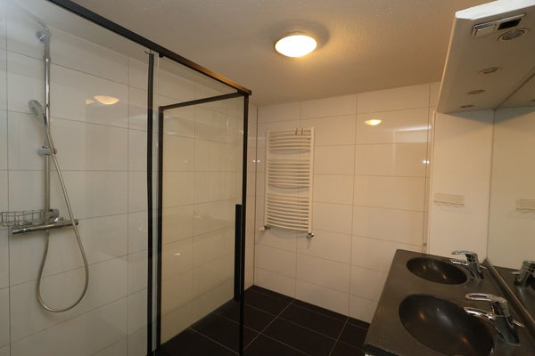 Amplio baño azulejado de aproximadamente 2.50 x 2.20 con cabina de ducha, mueble de lavabo con doble lavabo y un radiador de diseño.