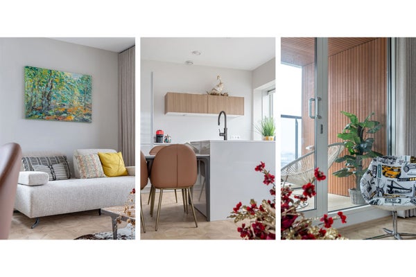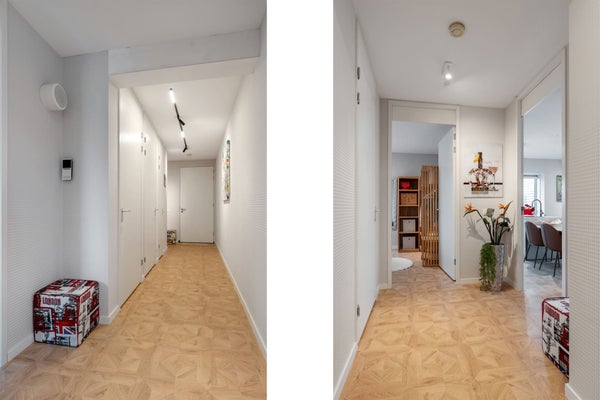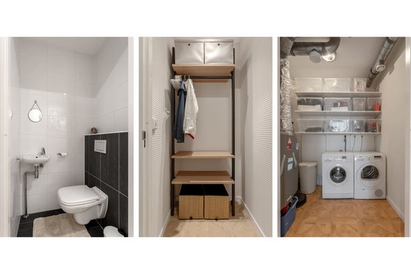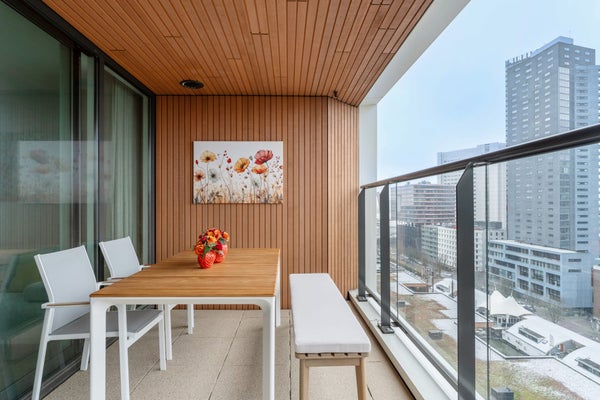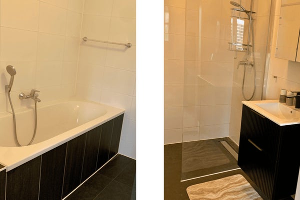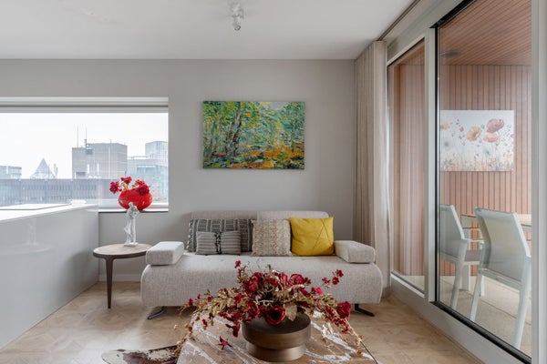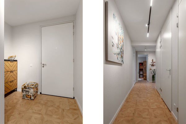 12º piso Entrada al apartamento en el 12º piso. Al entrar, encontrará el pasillo con acceso a todas las habitaciones. El luminoso y abierto espacio vital consta de una cómoda zona de estar y un comedor y está en conexión directa con la cocina abierta. La cocina está moderna y equipada con, entre otras cosas, un Quooker, refrigerador con congelador, placa de inducción, lavavajillas y un horno combinado microondas. En la sala de estar hay una televisión de 75 pulgadas. El amplio balcón es accesible desde la sala de estar.