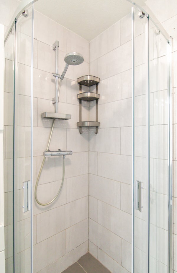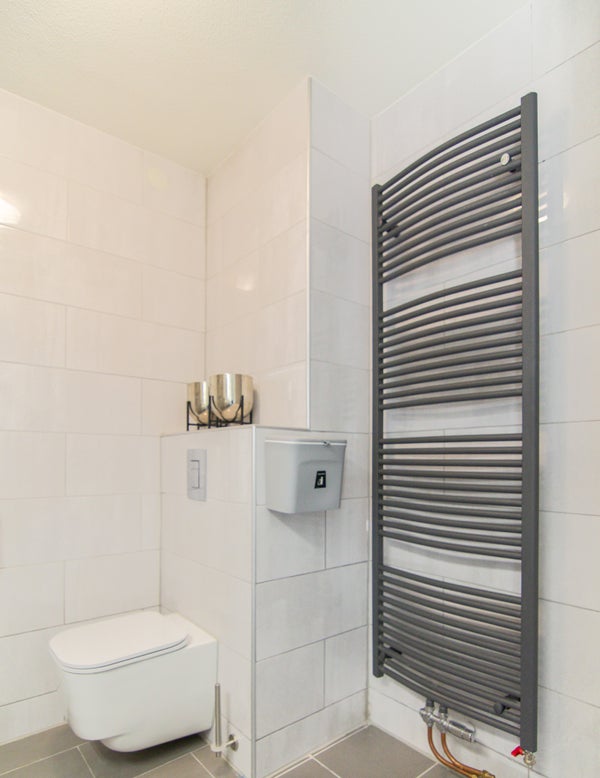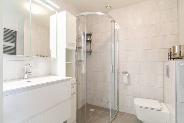 Baño; el baño de lujo (aproximadamente 7,2 m²) está completamente azulejado y cuenta con un amplio rincón de ducha con paredes de vidrio, un mueble de lavabo con mucho espacio de almacenamiento y un segundo inodoro.