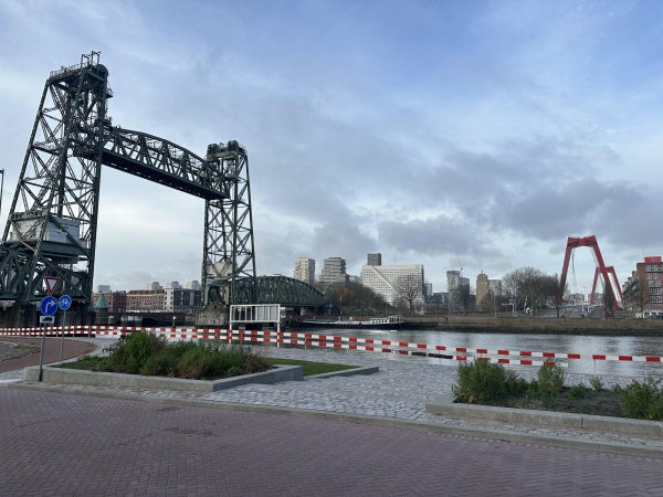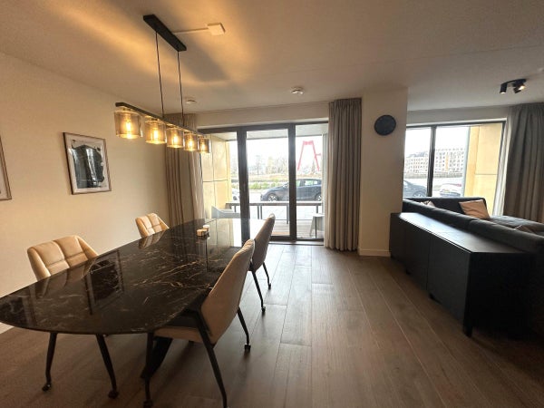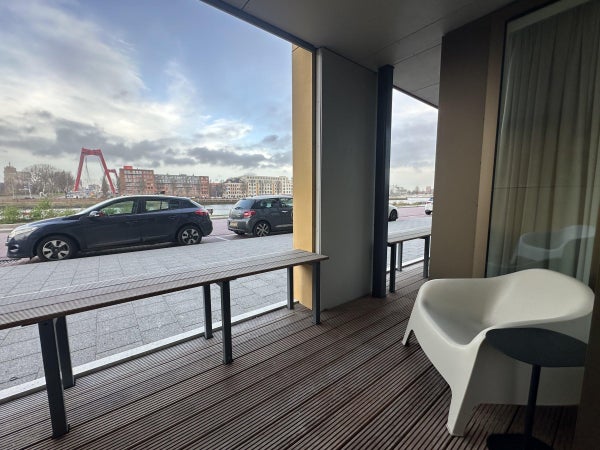 La vista de los alrededores, incluido el icónico Puente Hef, proporciona una experiencia de vida única que refleja magníficamente el encanto de Rotterdam. La terraza ofrece el lugar ideal para un momento de tranquilidad después de un largo día en la ciudad.