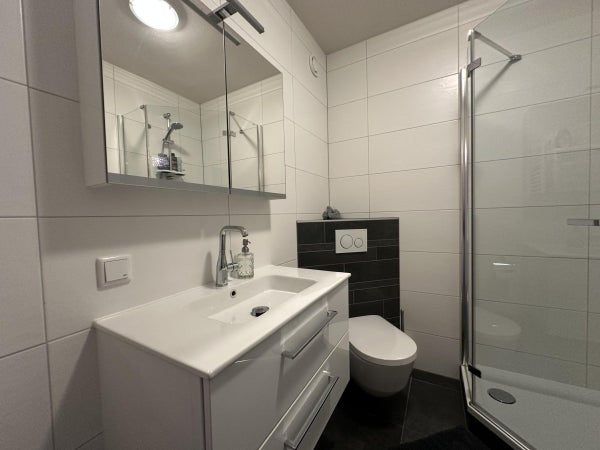 El baño tiene un lavabo con mueble, un inodoro adicional y un plato de ducha, además de espacio para la lavadora y la secadora. El inodoro es separado.