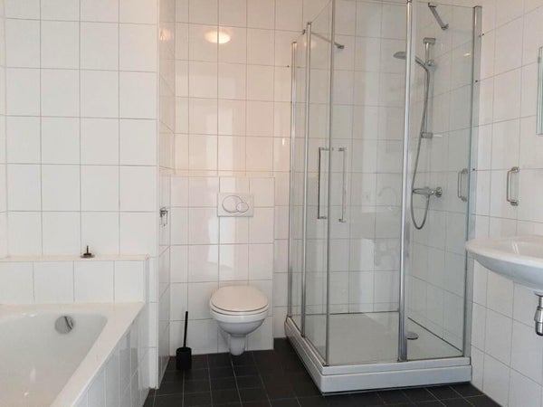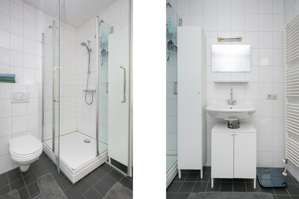 En la parte trasera hay dos grandes habitaciones. El baño moderno está equipado con una bañera, una ducha y un segundo inodoro. En el sótano, el apartamento cuenta con un amplio trastero privado.