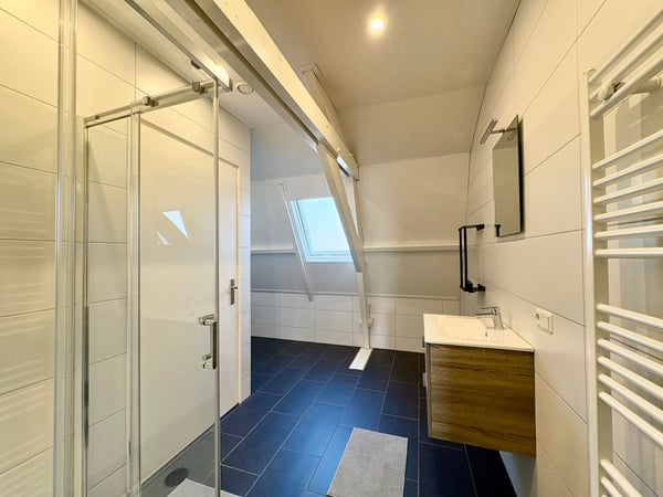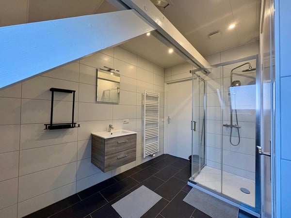 El amplio baño está equipado con un mueble lavabo, ducha y aseo. También hay una práctica sala de lavandería accesible desde el baño, donde se encuentra la instalación de calefacción.