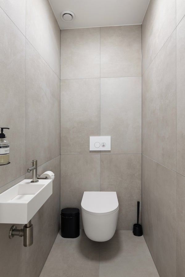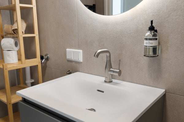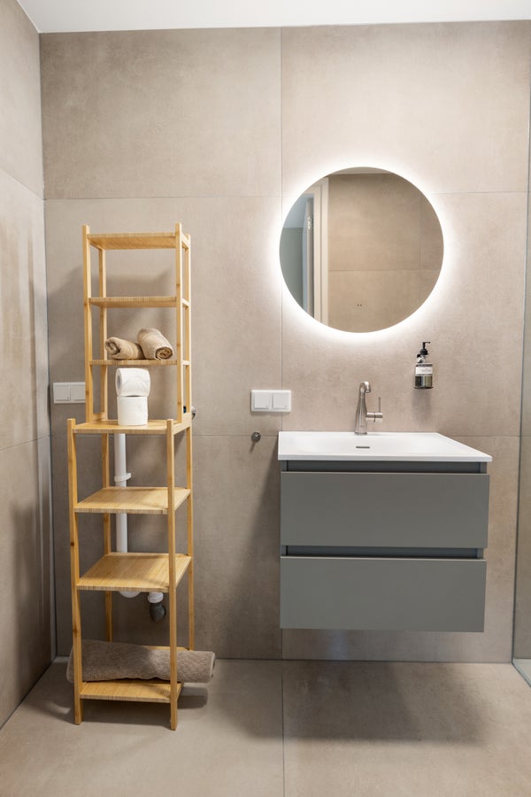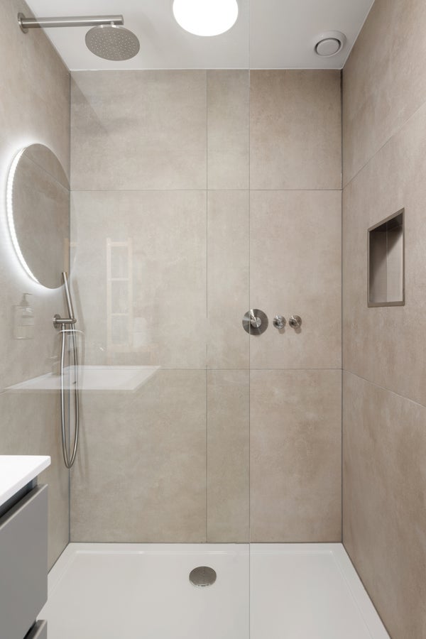Área de descanso cómoda, espacio de almacenamiento y un baño completamente nuevo con ducha a ras de suelo y lavabo.