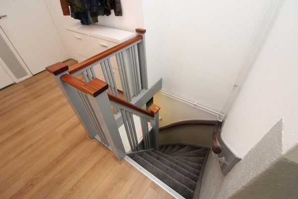 En el pasillo está la escalera hacia abajo donde se encuentra el baño con ducha y bañera separadas. También hay una habitación extra en este piso que se puede utilizar para varios propósitos.