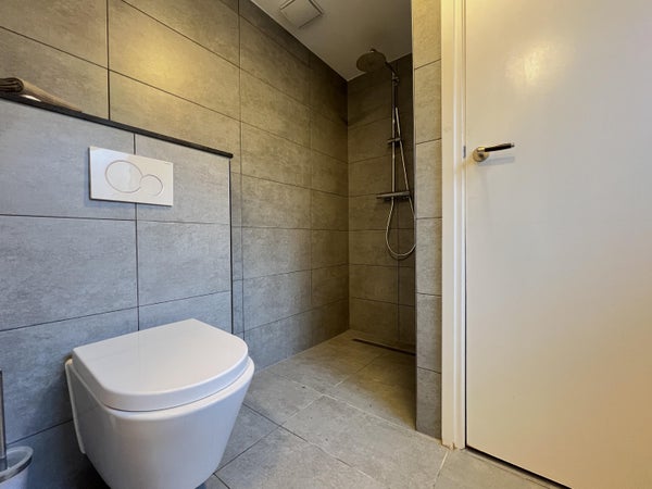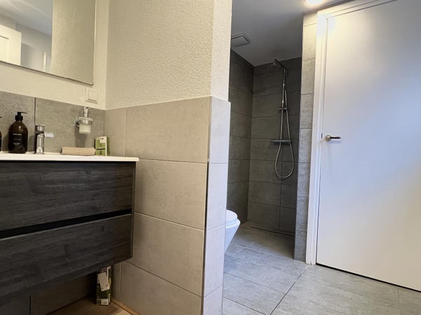 El baño es moderno y está equipado con un mueble de lavabo, ducha a ras de suelo y retrete. El apartamento también dispone de un cuarto de lavado separado con lavadora.