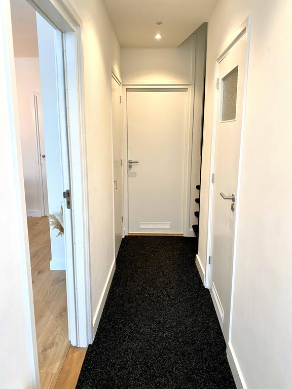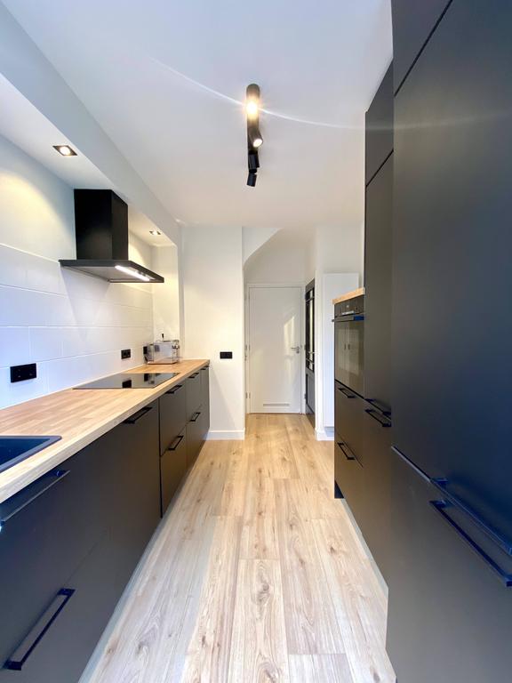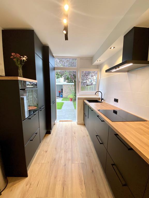 Luego encontrarás la cocina. Esta cocina moderna es totalmente nueva y tiene un acabado oscuro de lujo, una campana extractora de acero inoxidable y un lavavajillas empotrado. Puedes preparar la comida en la placa de inducción o en el horno. A través de la cocina o el dormitorio, accedes al amplio y bien cuidado jardín trasero de 60 m2. Un lugar encantador para disfrutar del aire libre.