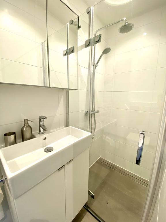 Volviendo al pasillo, encontrarás el baño moderno, con ducha de lluvia y inodoro.