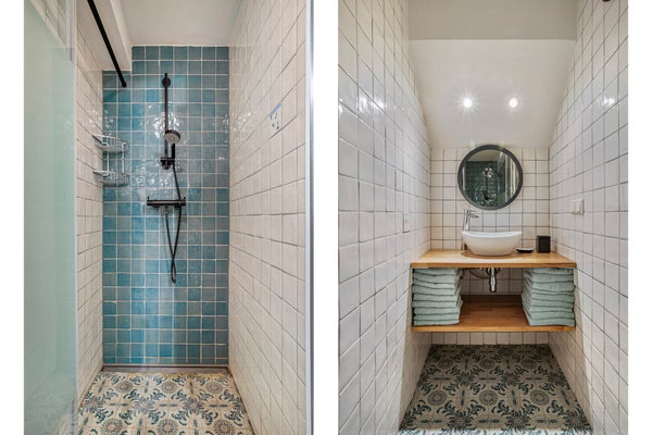El baño también se encuentra en el sótano, que está casi completamente revestido con hermosas piedras coloridas, tanto en las paredes como en el suelo. El baño luminoso contiene una amplia ducha y lavabo.