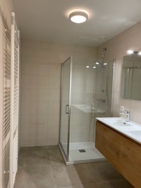 Baño de lujo con ducha a ras de suelo y mueble de baño. Radiador de diseño eléctrico.