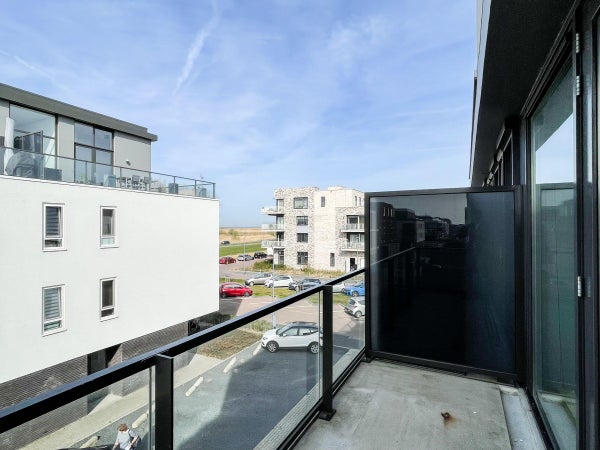 Living room with natural light, access to the balcony with excellent sun position (south west). The open plan kitchen is equipped with various built-in appliances such as an induction hob, combi microwave, fridge / freezer, dishwasher and an extractor hood.