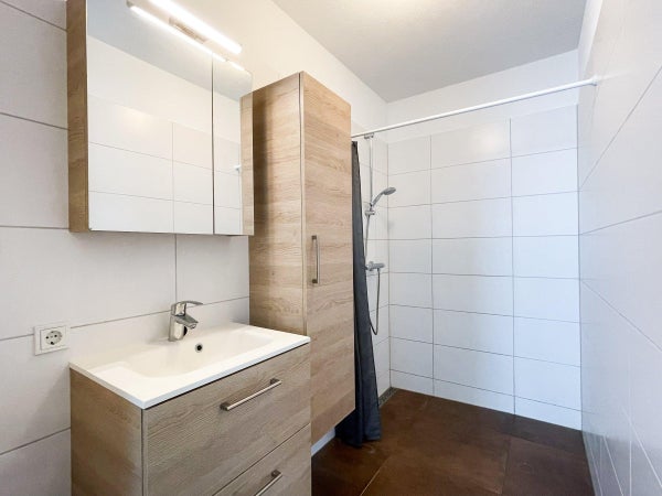 Through the hall access to the two bedrooms varying in size, the modern bathroom has a walk-in shower and a washbasin.
