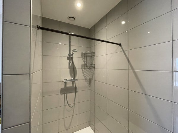 The 42m² apartment is cleverly designed and features an open kitchen equipped with a hood, induction cooktop, and a fridge-freezer combination. The bathroom is fitted with a spacious walk-in shower and a stylish sink cabinet. There is also a separate floating toilet.