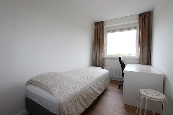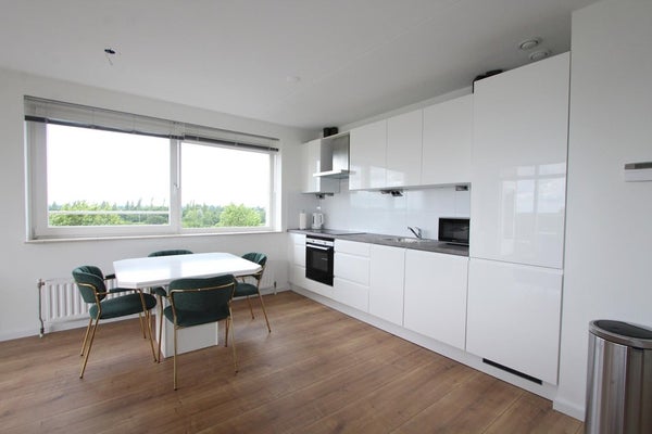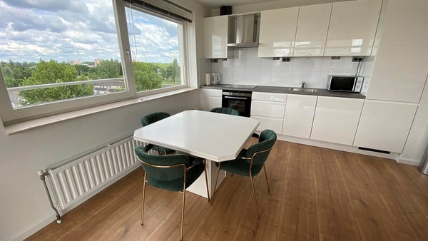 The apartment is on the eigth floor which is the topfloor. You have a beautiful view over the forest and when you lie on the couch you see how beatiful the sky is. Nice green area and very good to jog or walk and relax.