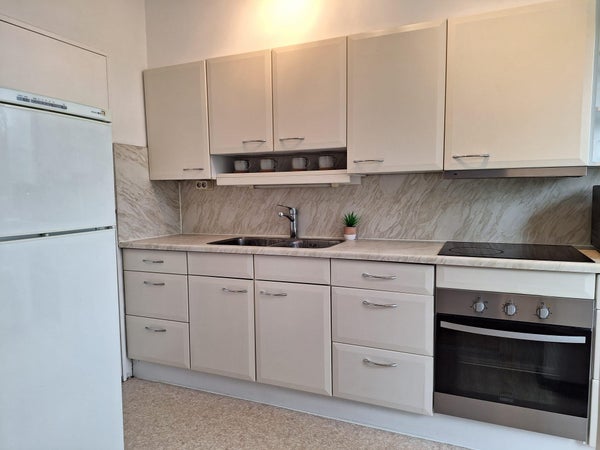 *Kitchen* - Semi-open to dining area. Fridge/freezer, built-in oven, microwave oven, electric cooking plate with cooker hood. Glass door to balcony.