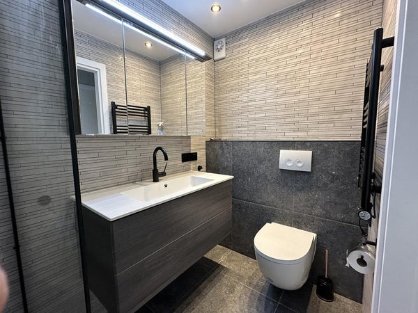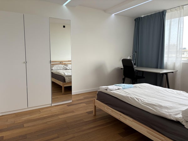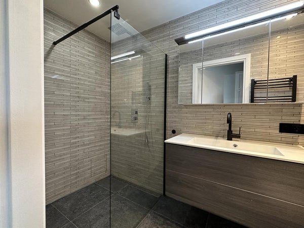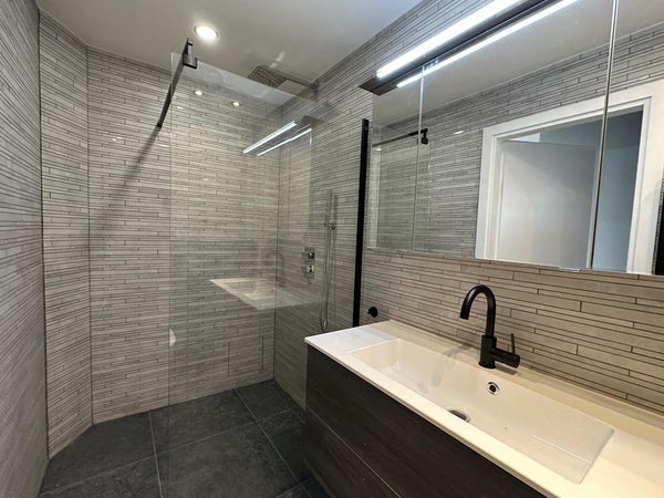 The apartment has two very large bedrooms. The bathroom has a double sink and a large walk-in shower. The toilet is separate and as the rest of the apartment.